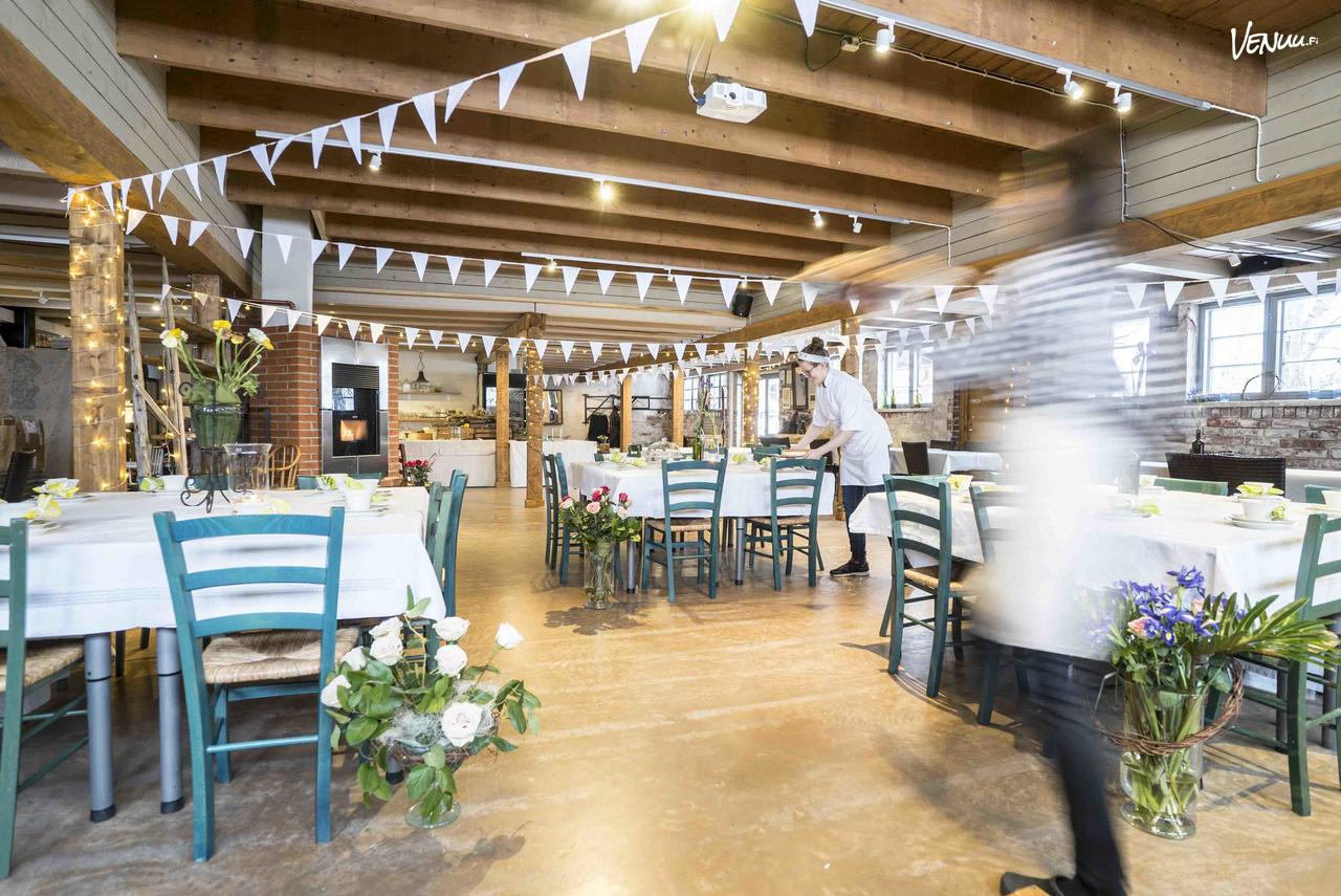 ”Tilaan mahtuu max. 100 henkilöä ja lisäksi meiltä löytyy myös käsintehdyt design-astiat 100 henkilölle. Kysy tarjousta! Kesäaikana on mahdollisuus käyttää vihkimisseromoniaan vanhaa tunnelmallista, jyrkkäkattoista vihkilatoa sekä hääväen kuljetuksiin vanhoja traktoreita ja peräkärryjä.