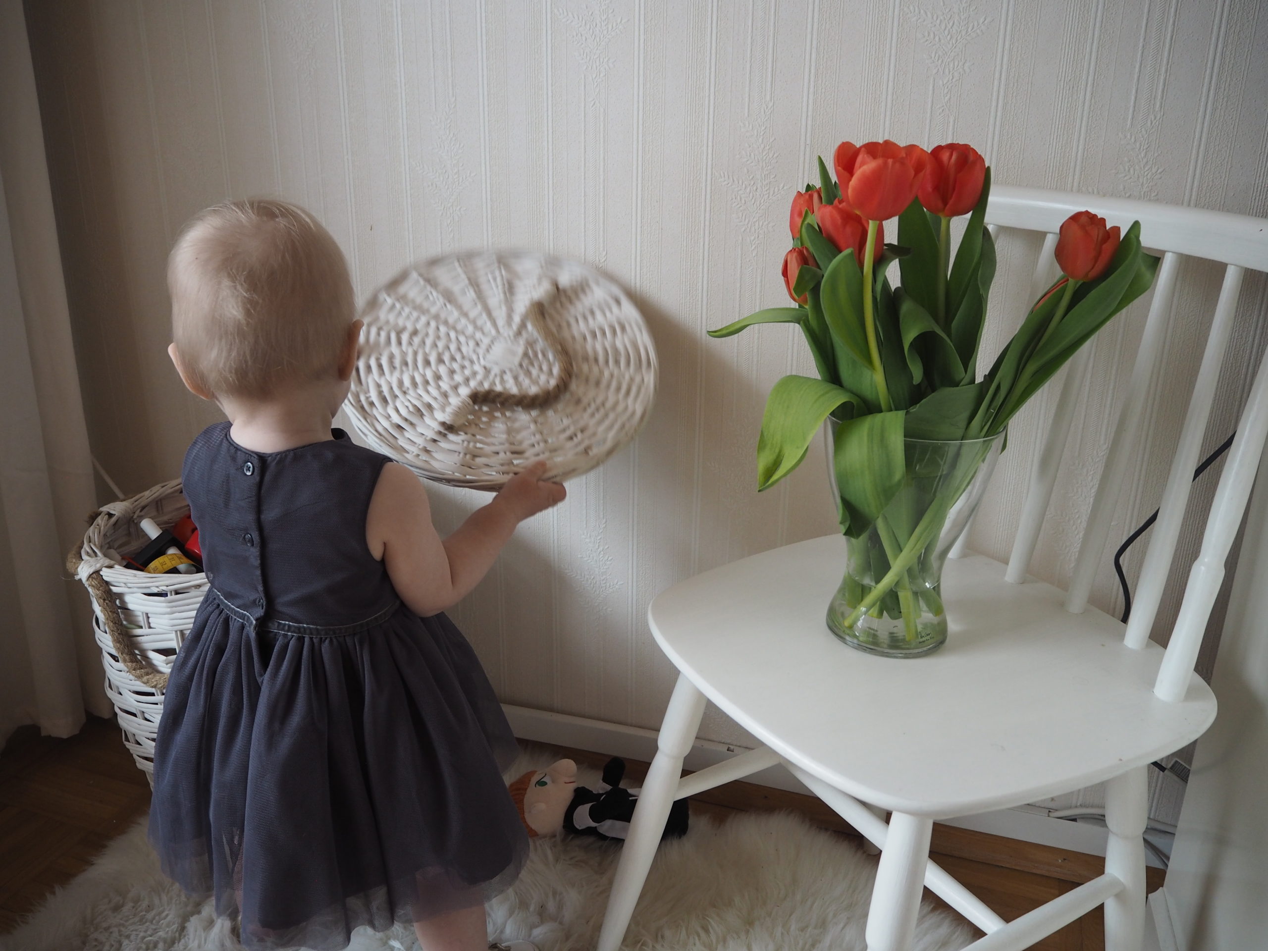 Postauksen kuvituksena yritykseni ottaa vauhdikkaasta tyttärestäni salonkikelpoisia yksivuotiskuvia.